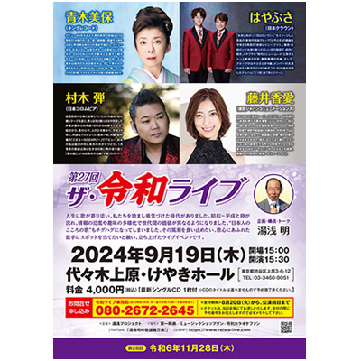 第27回 ザ・令和ライブ(終了) ライブ 【日時】 令和 6年9月19日(木) 開場 15:00 / 開演 15:30 【出演】 青木美保(キングレコード) はやぶさ(日本クラウン) 村木 弾(日本コロムビア) 藤井香愛(徳間ジャパンコミュニケーションズ)